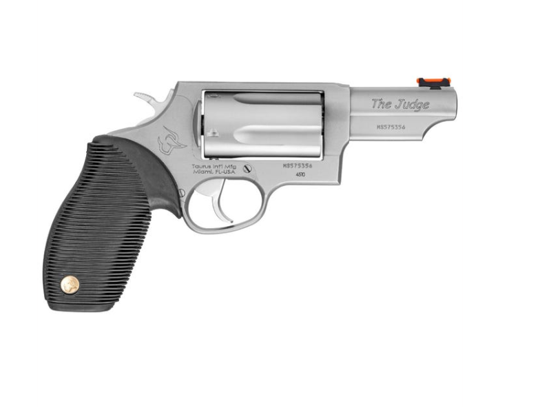 The Taurus Judge is named for the many judges who carry it into the courtroom for their protection, and it is capable of chambering both 410 gauge with 2-1/2" shotshell and the 45 Colt. This combo is ideal for short distances where most altercations occur and for longer distances with the 45 Colt ammo. The Taurus Judge is fully customized with fixed rear sights, fiber optic front sights, and finger grooved rubber grip. The safety features on this model include the Taurus Security System and a transfer bar. This model has a stainless steel metal finish and 3" barrel.